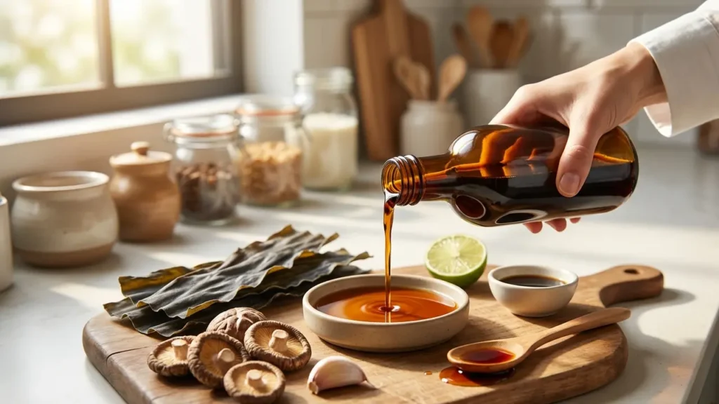 Vegan vissaus is een plantaardig alternatief voor traditionele vissaus. Het geeft dezelfde umami-smaak aan je gerechten, zonder vis of andere